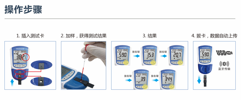測試范圍:總膽固醇【2.59-12.93mmol/L】、高密度脂蛋白【0.39-2.59mmol/L】、甘油三酯【0.51-7.34mmol/L】