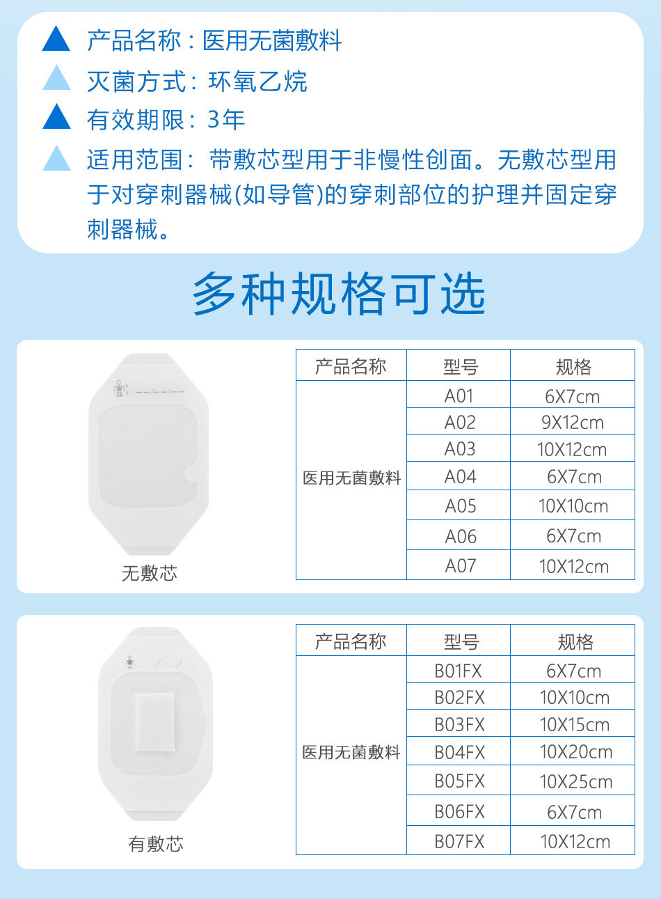 帶敷芯型用于非慢性創(chuàng)面 如淺表性創(chuàng)面、手術(shù)后縫合創(chuàng)面、機(jī)械創(chuàng)傷、小創(chuàng)口、擦傷、切割傷創(chuàng)面、穿刺器械的穿刺部位、I度或淺II度的燒燙傷創(chuàng)面、嬰兒肚臍口創(chuàng)口、激光/光子/果酸換膚/微整形術(shù)后創(chuàng)面)的護(hù)理,為創(chuàng)面愈合提供微環(huán)境。無敷芯型用于對(duì)穿刺器械(如導(dǎo)管)的穿刺部位的護(hù)理并固定穿刺器械。